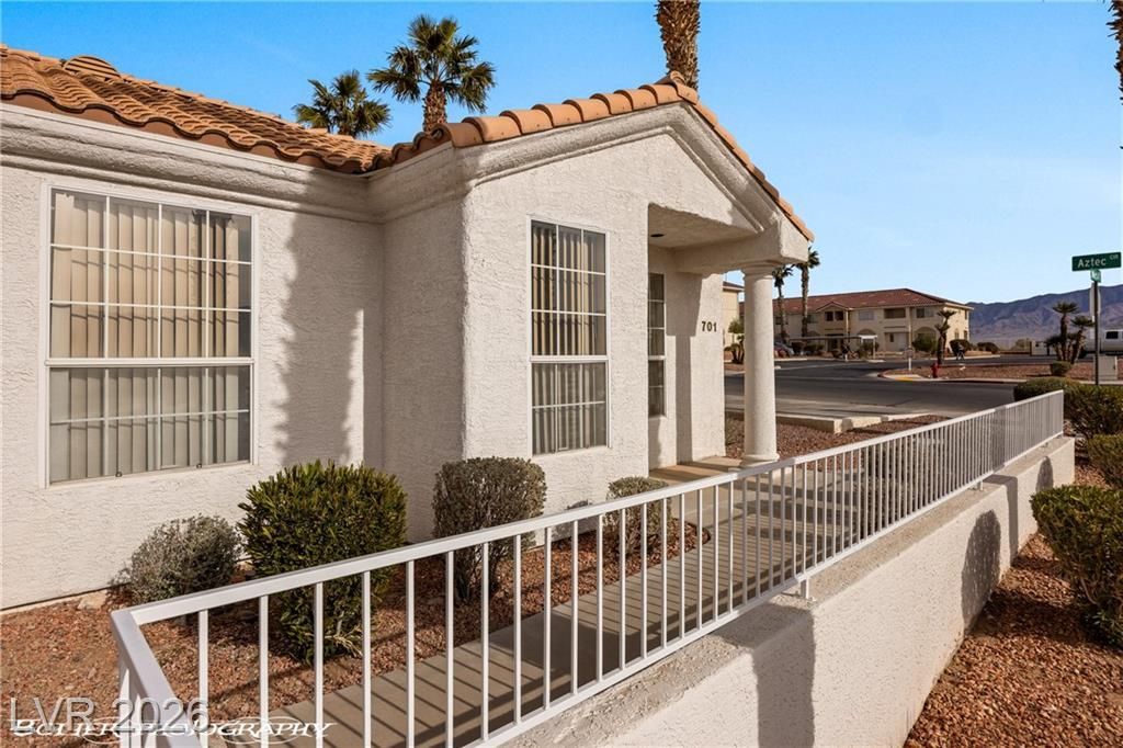 Welcome to 701 Aztec Circle, a charming 2-bedroom, 2-bath townhome with a detached garage, ideally situated on a corner lot at the southeast corner of Aztec Circle and Mesquite Boulevard in the desirable Mesa Townhome community of Mesquite, NV. This light-filled home features an open and inviting floor plan with a spacious living area that flows seamlessly into the dining space and kitchen?perfect for daily living or entertaining. The kitchen offers modern appliances, ample cabinetry, and a breakfast bar. The primary bedroom includes an ensuite bath, while the second bedroom is ideal for guests, a home office, or hobby space. Enjoy outdoor living on the covered patio with serene desert and mountain views. A detached single-car garage provides secure parking and extra storage. Conveniently located close to golf courses, shopping, dining, medical services, and recreation, this home is ideal as a primary residence, vacation getaway, or investment property.