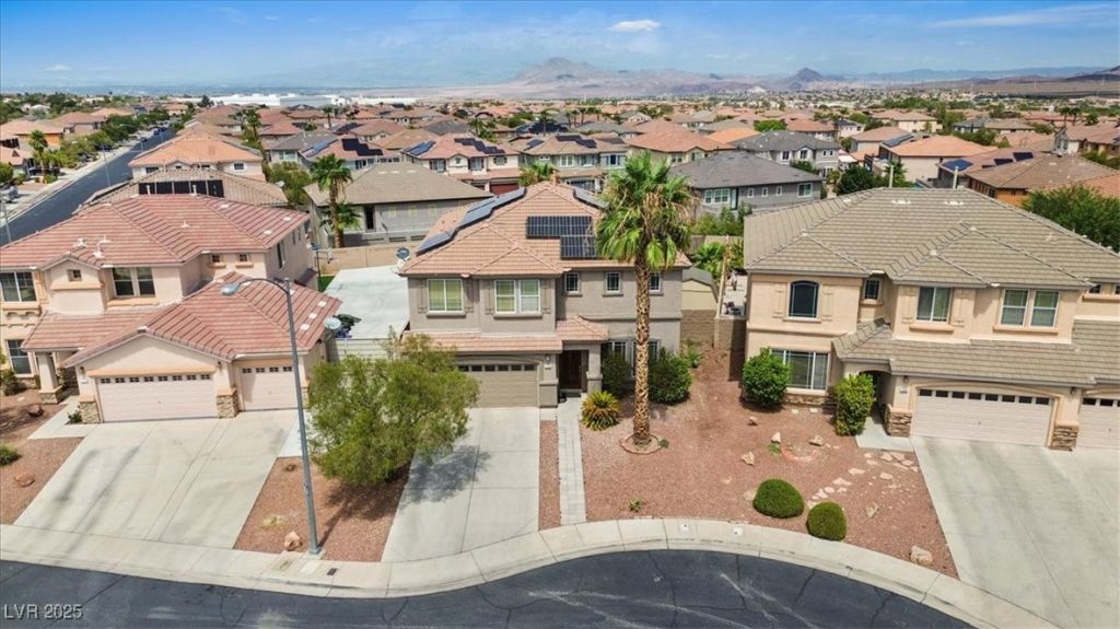 Beautiful 5 bedroom, 3 bath Henderson home with oversized 2 car garage and inviting floor plan. The primary suite is located upstairs and features a balcony and ensuite bath. An additional bedroom downstairs offers convenience for guests or multi-generational living. Tile flooring flows through the main living spaces, while bedrooms are carpeted for comfort. The kitchen showcases white shaker cabinets, a window over the sink, and an island with a stylish waterfall counter. A versatile upstairs loft provides space for work, play, or relaxation. The backyard is designed for entertaining, complete with a covered patio and sparkling pool/spa combination.