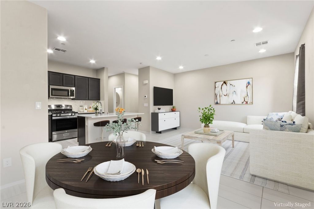 This gorgeous townhome, built in 2020 in a gated community, shows like new. The well-designed 3-bedroom, 2.5-bath home features a private front courtyard with flowering plants and tile flooring throughout the open-concept first floor, creating a clean and modern living space. The primary suite is thoughtfully separated from the secondary bedrooms for added privacy and includes a bathroom with dual vanities and a walk-in shower. The second floor offers two additional bedrooms and a full bathroom, providing a comfortable and functional layout for family or guests. Located in a community with a BBQ area, CC&Rs, gated entry, guest parking, and a playground. Perfectly situated with quick access to both the 215 and 95 freeways, nearby shopping centers, and just minutes from the up-and-coming Downtown Henderson. Appliances convey, making this home truly move-in ready!