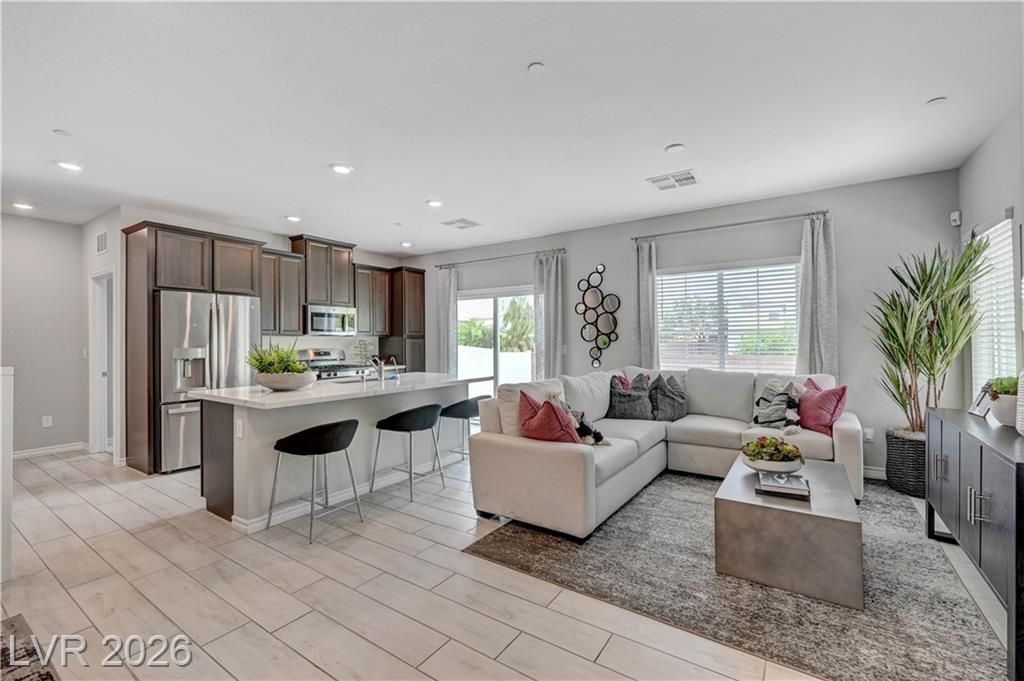 This former model home is a 2-story townhome featuring a spacious, open-concept layout designed for modern living. Featuring 3 bedrooms, 3 bathrooms, and a 2-car garage, this home stands out with a highly sought-after bedroom and full bath located downstairs. The gourmet kitchen is a chef's dream, boasting luxurious quartz countertops, a large center island, and premium stainless steel appliances. The rich espresso brown cabinetry provides a sophisticated contrast to the home's designer-inspired color palette of white, light gray, and dark gray, creating a modern and elegant aesthetic throughout. This property showcases premium finishes and a private, low-maintenance backyard oasis with stylish pavers and synthetic grass. Nestled within the gated community of Roxbury At Valley Vista, you'll also enjoy access to a sparkling pool. Located just minutes from top schools, dining, and shopping with easy access to the 215, this home offers the ultimate blend of style and convenience!