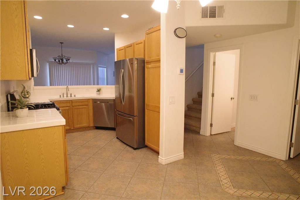 Discover comfort and convenience in this immaculate three-bedroom condo located in a prime central location, just moments away from shopping, restaurants, parks, airport, and the vibrant Las Vegas Strip. This property boasts a spacious open layout with a bedroom and bathroom downstairs, accompanied by a large two-car garage. The kitchen seamlessly flows into the dining room and showcases like-new stainless steel appliances and generous breakfast bar. Enjoy an abundance of natural light in the living area, complete with vaulted ceilings, surround sound, and an upgraded ceiling fan. Upstairs, the primary suite awaits, featuring a large walk-in closet, dual sinks, makeup area, spacious soaking tub, and separate shower. Take advantage of the community's clubhouse amenities, including pool, spa, and gym area for your leisure and fitness needs. With all appliances included, this condo is ready for immediate occupancy, offering everything you could ask for.