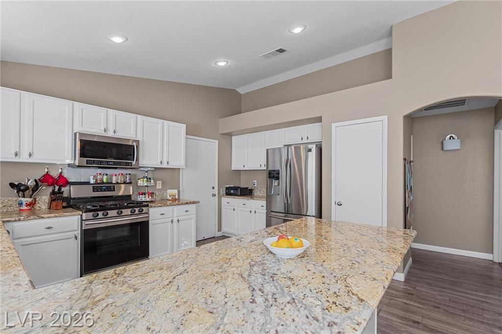 Stunning single-story home with a fantastic open floor plan, a private primary suite separate from the guest bedrooms. Nestled in the desirable northwest part of the valley, you're just minutes from the natural beauty of Desert Shore. This 3-bedroom, 2-bath home is truly the crown jewel among gems. The remodeled kitchen shines with white cabinetry, granite countertops, and stainless steel appliances, all open to the dining area and family room?perfect for entertaining and everyday living. The primary bathroom features a state-of-the-art walk-in tub, separate shower, granite counters, and dual mirrors for a spa-like experience. Durable LVP flooring flows through the common areas, while plush carpet in the bedrooms keeps your toes warm on chilly mornings. Step outside to relax in your backyard with natural shade and low-maintenance artificial turf. Conveniently located near shopping, dining, and with easy freeway access, this home offers comfort, style, and convenience.