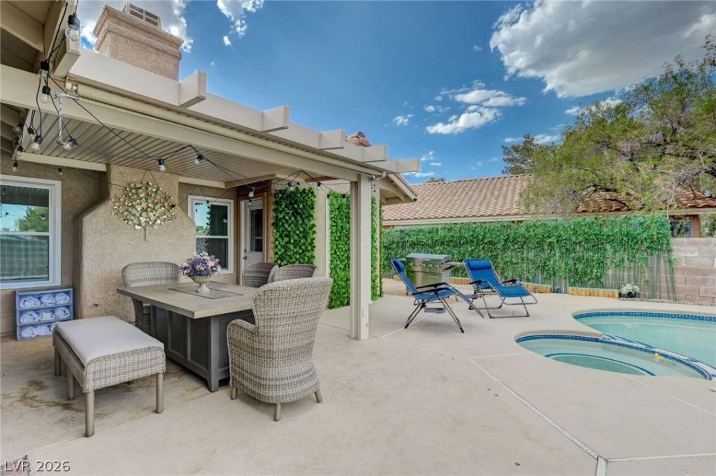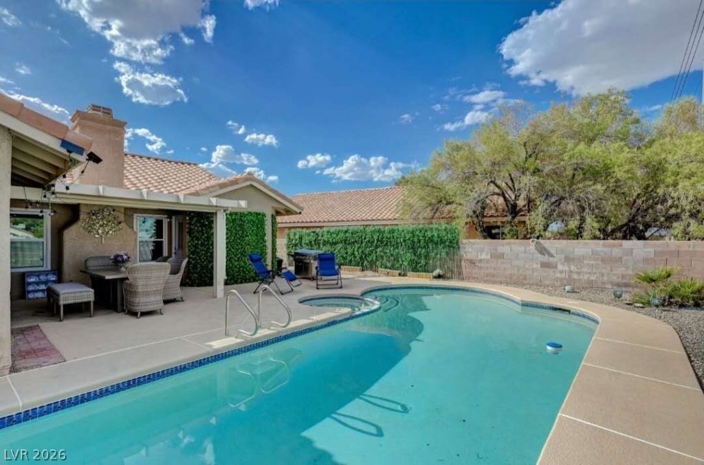 ALL APPLIANCES AND LUXRY FURNITURES STAY! SPACIOUS SINGLE STORY CHARMER IN A GREAT SOUTH LOCATION MINUTES TO THE AIRPORT, THE STRIP, AND THE 215 BELTWAY! ENJOY YOUR SPARKLING POOL AND BBQ THIS SUMMER IN YOUR PRIVATE YARD UNDER A COOL COVERED PATIO. LIVING ROOM/DINING ROOM COMBO, SPACIOUS PRIMARY SUITE HAS A SEPARATE SHOWER AND SOAKING TUB, DUAL VANITY SINKS, AND TWO WALK-IN CLOSETS. THE THREE SECONDARY BEDROOMS ARE SPACIOUS AND HAVE CUSTOMIZED CLOSETS. ONE BEDROOM INCLUDES A CUSTOM WALL BED W/BUILT-IN SHELVES AND NO CLOSET. CHEF'S KITCHEN BOASTS DARK WOOD CABINETRY, GRANITE COUNTERTOPS, STAINLESS STEEL APPLIANCES, TILE FLOOR, RECESSED LIGHTING AND A CONVENIENT BREAKFAST BAR. SEPARATE FAMILY ROOM WITH A COZY GAS FIREPLACE. AND BEST OF ALL, NO HOA!!!