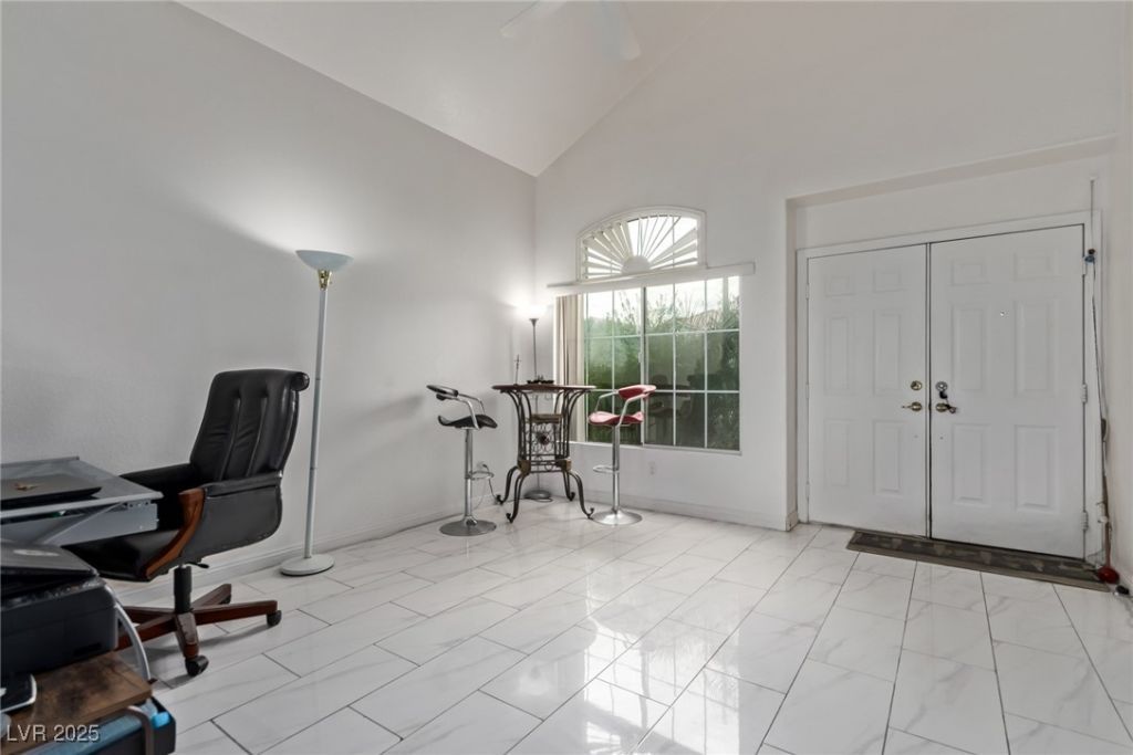 No HOA Neighborhood, 3-bedroom, 2.5-bath home offering 1,527 sq. ft. of comfortable living space, 2-car garage, gas fireplace, on a larger-than-average 4,356 sq. ft. lot, and no rear neighbors. Nestled in a desirable community just minutes from Summerlin, Chinatown, and the Las Vegas Strip, this property combines convenience, value, and peace of mind. Step inside to find a light-filled interior featuring upgraded tile flooring downstairs and an open layout designed for modern living. The kitchen features a breakfast bar, ample cabinet space, and direct access to both the dining and living areas?ideal for entertaining or enjoying relaxed evenings at home. Upstairs, the spacious primary suite includes dual sinks and a full bath, while two additional bedrooms share a hall bath. A convenient half bath is located on the main level. Private backyard with low-maintenance desert landscaping. An Inexpensive Solar Lease is in place to be assumed by the buyer. Schedule a showing today!