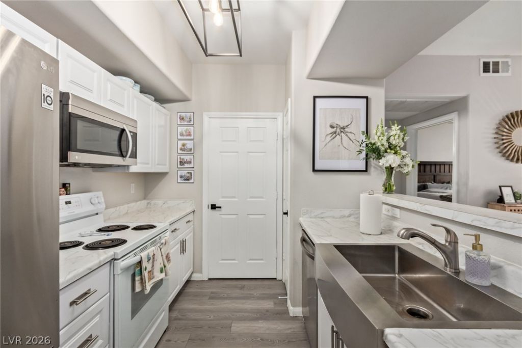 Beautifully updated first floor condo in one of the most desirable gated communities in Southwest Las Vegas. Ideally located near the 215 freeway, shopping, dining, and everyday conveniences, this move in ready home offers the perfect low maintenance Las Vegas lifestyle. The open layout features modern wood look LVP flooring, fresh white cabinetry, stainless steel appliances, and a striking farmhouse sink that anchors the kitchen. The spacious living area flows seamlessly to a private covered patio, creating great indoor outdoor flexibility. The bathroom has been thoughtfully upgraded with a custom vanity and granite shower surround. Additional improvements include updated HVAC components, water heater, ceiling fans, and included appliances. Enjoy resort style amenities including gated entry, pool, spa, clubhouse, fitness center, and playground. This is the Southwest condo opportunity you have been waiting for.