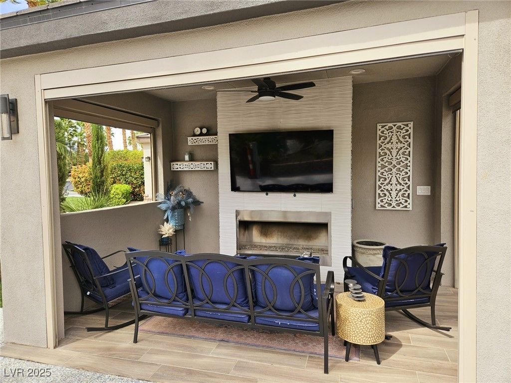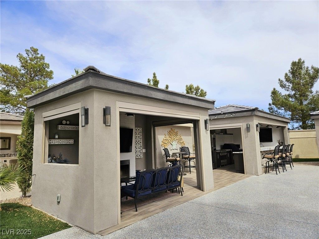 Located within the Class A Las Vegas Motorcoach Resort, this site is spectacular in every sense of the word! This site has it all including three hard roof structures, motorized shades, gorgeous stone, and granite, living room area with ceiling heaters, TV & fireplace, gourmet kitchen with ceiling heaters, fans, huge bar seating, buffet table, 80 TV, Viking appliances, Samsung refrigerator, motorized awning, comfort station, washer/dryer, water softener, storage room, upgraded flooring, and so much more!