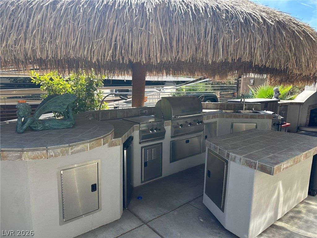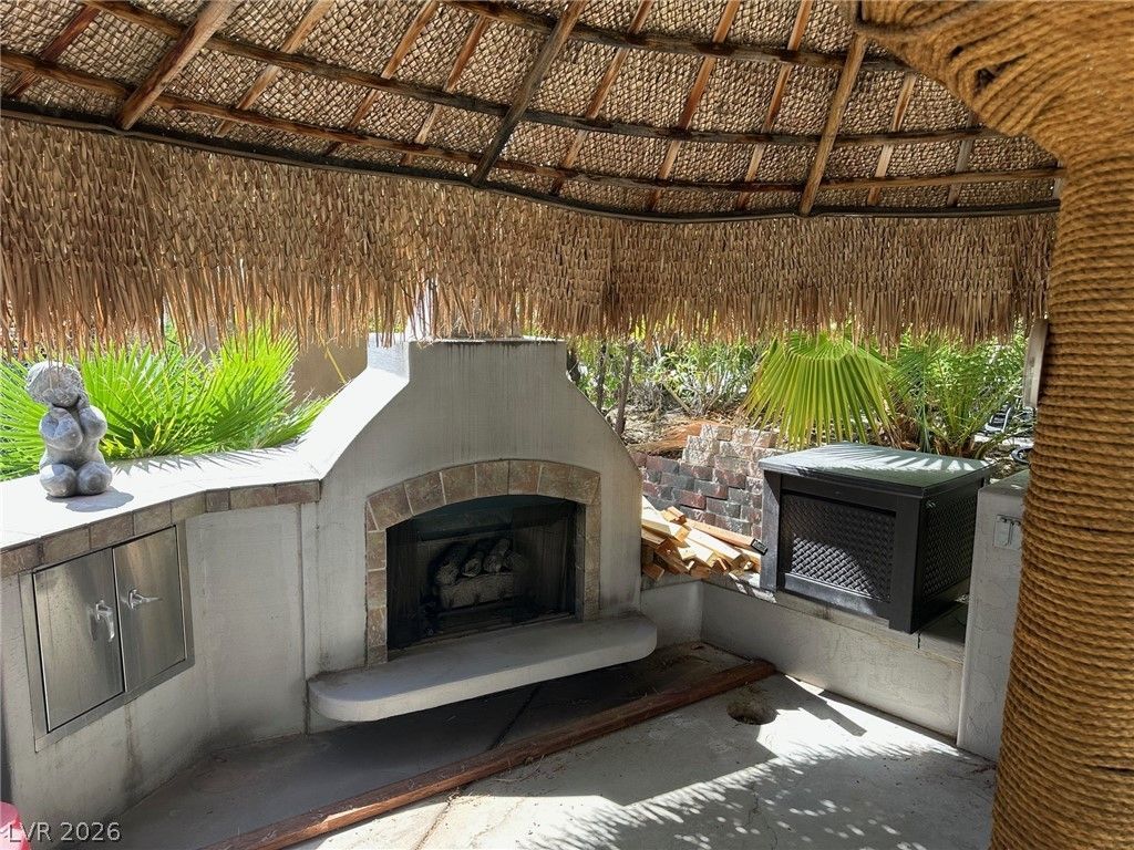 Lot 106 at the prestigious guard-gated Las Vegas Motorcoach Resort offers an exceptional blend of luxury, comfort, and prime location. Ideally situated adjacent to the resort's main clubhouse, pool, fitness center, pickleball courts, and an array of upscale amenities, this beautifully appointed lot is designed for both relaxation and entertaining. The outdoor living space features a well-equipped kitchen beneath charming shade palapas, a spacious living room area with a cozy fireplace, and a convenient storage shed. Surrounded by lush, mature landscaping, this lot provides a private oasis while keeping you in close proximity to the vibrant heart of the resort.