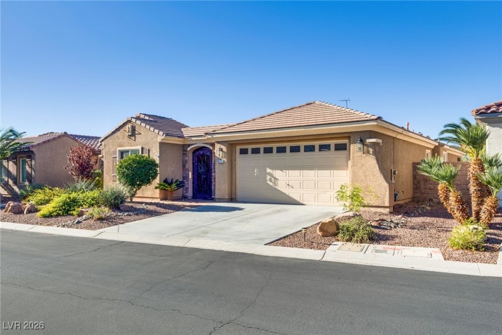 PRICE REDUCED, DON'T MISS OUT! Stunning guard-gated community of The Palms at Silverstone Ranch! Peace and tranquility await! 1-story beauty w/ view of mountains! Walk through gated courtyard to front door. 3 bdrms, 3 baths, shutters thru-out, central vac, kitchen open to living area. New luxury vinyl flooring. Kitchen has stainless appliances, walk-in pantry, granite countertops, tile backsplash, butcher-block coffee area, HUGE island! Kitchen over looks lgrm w/ cozy fireplace. Step out to your covered patio to enjoy the mountain views, real grass, garden areas, fruit trees, flat-screen TV! The Primary bdrm has slider to your covered patio! Primary bath has a tub PLUS spacious walk-in shower! Other bedrooms share a bathroom with walk-in shower. Laundry day is a breeze in the laundry room complete with sink, washer/gas dryer, refrigerator, cabinets! Enjoy living in one of Las Vegas' premier communities! WELCOME HOME!