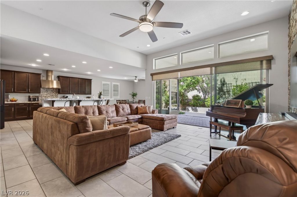 Experience elevated single-story living in Skye Canyon. A private courtyard entry sets a tone of exclusivity, opening to soaring vaulted ceilings and a grand, open layout. The family room stuns with a dramatic rock accent wall, while the fully remodeled 2023 kitchen blends style and function with premium finishes and a collapsible sliding window wall for seamless indoor/outdoor living. The primary suite is a true sanctuary, featuring a spa-inspired bath with refined upgrades, soaking tub, and walk-in shower, plus a custom-designed closet (2024). Thoughtful enhancements include a remodeled pantry, custom shutters, Everlight exterior system, and a newer HVAC unit (2023). Outside, a lush yet low-maintenance backyard with mature landscaping creates a private retreat. Even the smallest details?from custom pantry organization to soft lighting and mature landscaping?have been curated to make life easier, more comfortable, and truly enjoyable.
