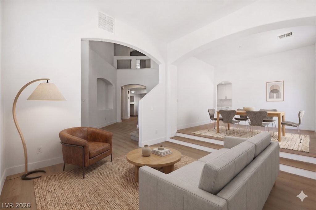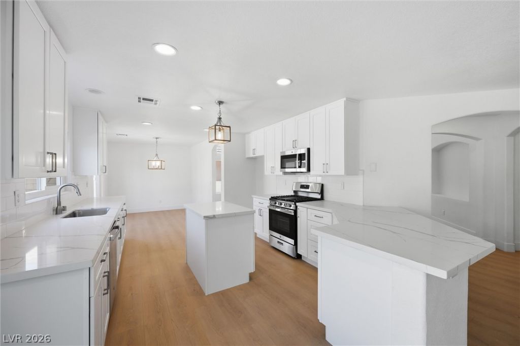 This stunning 4-bed, 2.5-bath, 3-car garage home spans 2,631 sq ft in a gated community with a no-compromise renovation throughout. The kitchen was gutted and rebuilt with all-new cabinetry, quartz counters, stainless appliances, and new stainless sink. The upstairs guest bath was fully gutted and refreshed. Luxury vinyl plank flooring, new baseboards, new recessed lighting, and fixtures, new doors and fresh paint give every room a sharp, modern feel. All moveable windows and the exterior slider were replaced. Even the laundry room got new cabinets with quartz counters. Solar panels provide energy efficiency via a power purchase agreement. The backyard delivers a gazebo-covered patio, fire pit with generous seating, and a large yard to build your oasis. Community features two parks and a landscaped walking trail with benches and lighting. Minutes to Floyd Lamb State Park, shopping, dining, and freeway access. This isn't a cosmetic flip ? it's a true remodel. Come see the difference.