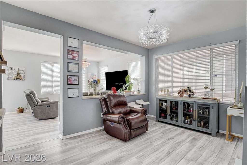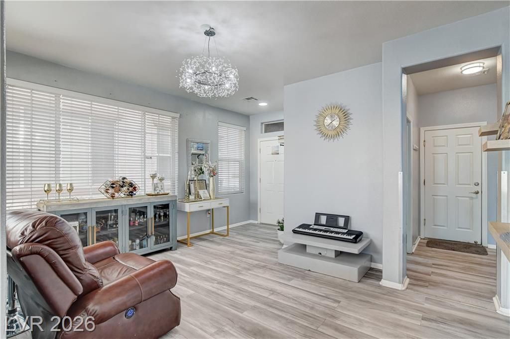 Beautifully renovated 4-bedroom home in the desirable Mountains Edge master-planned community?move-in ready and shows like a model! Enjoy stunning mountain views and easy access to parks, trails, playgrounds, dog parks, and sports fields. The open floor plan features luxury laminate wood flooring and two-tone paint throughout. The upgraded kitchen offers white custom cabinetry, stainless steel appliances, new dishwasher, breakfast bar, and color-changing accent lighting. Spacious living area includes surround sound and dining space with double doors leading to the patio.