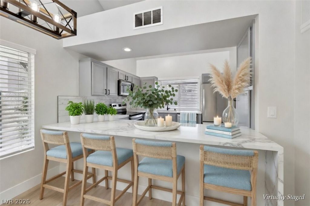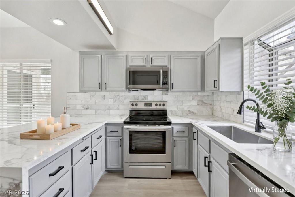 This stunning home has been completely remodeled top to bottom! Every detail was carefully upgraded with premium finishes throughout. Featuring brand new quartz countertops in the kitchen and bathrooms, stainless steel appliances, and a beautiful marble backsplash in the kitchen. Enjoy the custom tile fireplace, new Luxury Vinyl Plank flooring throughout, fresh interior paint, upgraded 5.5 baseboards, and modern light fixtures. The garage floors have been professionally epoxy coated for a clean, durable finish. Home has newer central HVAC plus an additional wall unit in the upstairs primary bedroom. Bright, modern, and turnkey ? this beautifully updated property offers style, comfort, and value in one of Las Vegas's desirable neighborhoods The Lakes at Summerlin. Perfect for families, first-time buyers, or investors seeking a turnkey property for buy and hold. Don't miss this rare opportunity on a fully renovated home. Schedule your showing today before it's gone.