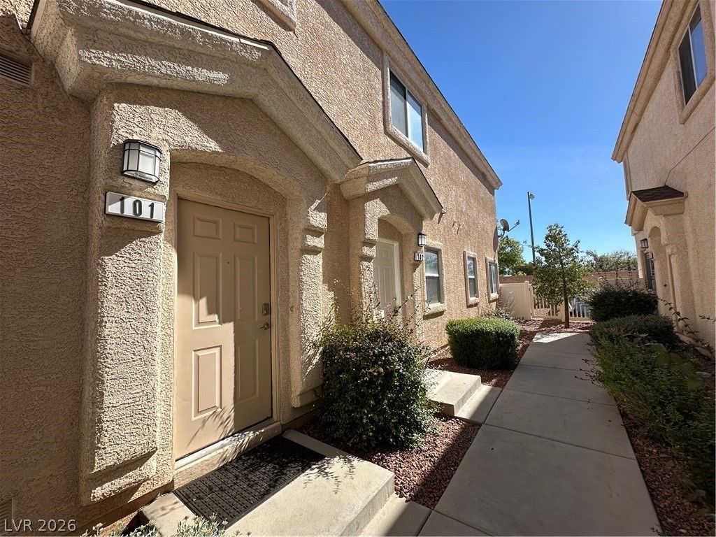 Lovely two story townhouse with its own backyard! 2 bedrooms and 2 bathrooms with a one car garage. Located in a gated community with a community pool and walking trails near Mountain's Edge. The whole house is freshly painted ***NO CARPET*** The price includes $80 for Water, Trash & Sewer.
