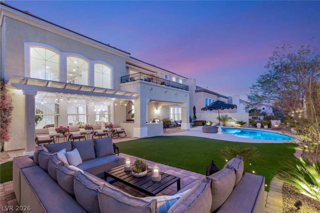 Fully reimagined luxury estate in guard-gated Queensridge, showcasing Strip, mountain, and golf course views with no rear neighbor. Recently upgraded with refined finishes that blend timeless design and modern sophistication. The chef's kitchen features quartz countertops and built-in stainless appliances, opening to a light-filled family room with soaring ceilings. Formal living, dining, office/den, and a main-level bedroom complete the layout. The primary suite offers a private balcony with motorized awning, dual custom California closets, and a spa-inspired bath with soaking tub and oversized shower. Resort-style backyard with solar-heated pool, new pump, Kool Deck, outdoor kitchen, pergola, and lush landscaping. Three new HVAC systems. Prime location near Downtown Summerlin.