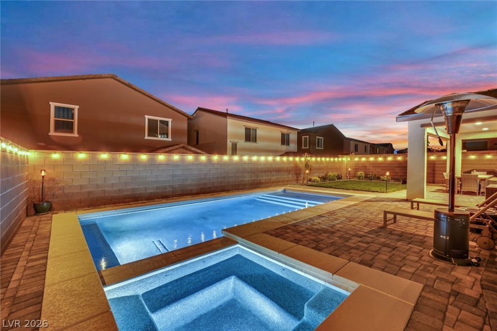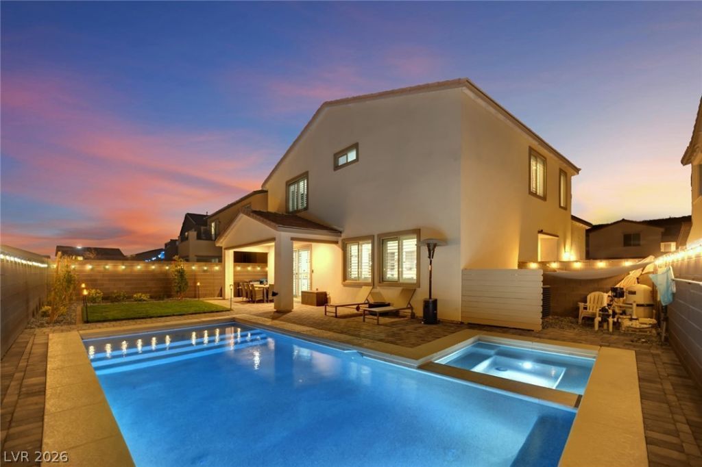 Two-story home built in 2023 in the gated Sunstone community in the Centennial Hills area of northwest Las Vegas featuring a private heated Pebble Sheen pool & spa with in-ground cleaning system & owned solar panels. This 4 bedroom, 3 bath layout includes a bedroom & full bath on the main level for guests, office, or flexible living. The open concept great room connects to the kitchen with island seating, walk-in pantry, dining area, & built-in coffee bar with wine fridge designed for everyday living & entertaining. The main level features upgraded luxury vinyl plank flooring throughout the living spaces. Upstairs a loft provides additional living or workspace. The primary bedroom offers walk-in closet & spacious bath with dual sinks. An owned water softener & plantation shutters throughout add comfort & convenience. Finished backyard & covered outdoor space create indoor-outdoor living. Located near parks, shopping, & commuter routes.