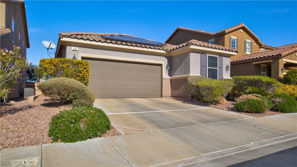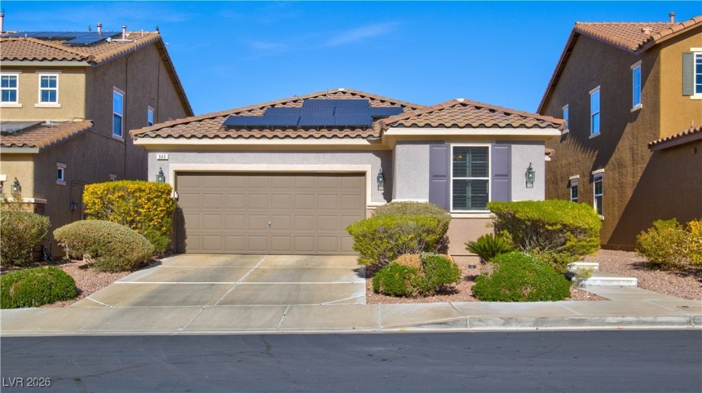 Single-story Henderson home with Strip views, solar, and a private backyard designed for outdoor living. This move-in ready 3-bedroom plus den home features an open kitchen with granite countertops, a large island, stainless steel appliances, upgraded cabinetry, tile backsplash, and a walk-in pantry. Natural light is enhanced by solar tubes, with tile flooring, shutters, ceiling fans, and recessed lighting throughout. The primary suite is positioned separately from secondary bedrooms for added privacy and includes a spacious layout. Step outside to a backyard with artificial turf, paver patio, mature landscaping, and rear metal fencing capturing open city and Strip views. Covered patio supports year-round use. Garage includes built-in cabinets, workbench, and 220V outlet for EV charging. Solar system adds efficiency. Located near parks, playground, putting green, and walking paths with convenient access to shopping, dining, freeways, and the airport corridor.