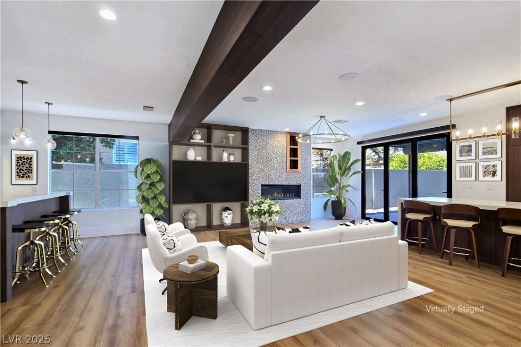 In the heart of Peccole Ranch, this renovated two-story home offers 3,281 sq ft of style and sophistication. The flowing floor plan features 4 bedrooms, 3 full baths, a bar, and a 3-car garage. Designer touches include updated flooring, a dramatic staircase, and a gourmet kitchen with high-end cabinetry and premium appliances. Enjoy quiet moments or lively gatherings indoors, or step outside to the private retreat with sparkling renovated pool and spa. Direct access to the community greenbelt and clubhouse is just across the street. Conveniently located near shopping, dining, schools, and more, this residence combines comfort, elegance, and lifestyle in one of Las Vegas's most desirable neighborhoods.