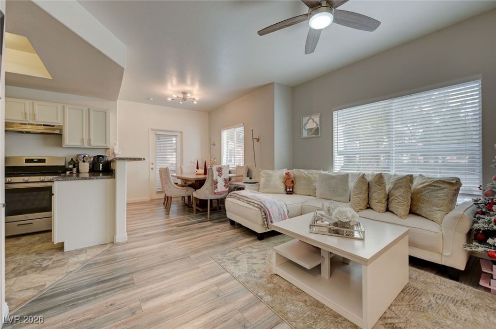 Welcome to this beautifully maintained first-floor residence in the gated Amber Hills community. This 2-bedroom, 2- bathroom condo offers a bright, open floor plan with a spacious living area and a well-appointed kitchen complete with stainless steel appliances and breakfast bar adjacent to the dining area. The primary bedroom includes an en- suite bathroom and a generous walk-in closet. Enjoy the convenience of in-unit laundry and your own private covered patio for relaxing evenings. Located just minutes of the 215 freeway, the new Durango Casino, restaurants, shopping, and everything the Southwest has to offer.