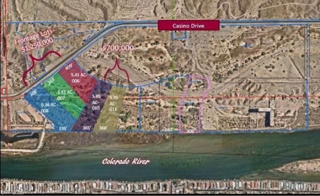 Five Lots available along the Colorado River $1,250,000 each for Lots 1, 2 and 3 - Casino Drive Frontage $700,000 each for Lots 4 and 5 Lot 1-APN # 264-27-403-006/ 5.41 Acres Lot 2-APN # 264-34-101-007/ 5.81 Acres Lot 3-APN # 264-34-101-008/ 6.36 Acres- Effective Size 5.56 due to drainage easement Lot 4-APN # 264-34-101-010/ 5.85 Acres Lot 5-APN # 264-34-101-011/ 5.35 Acres Clark County Jurisdiction